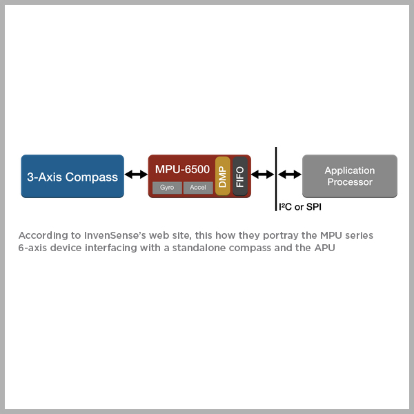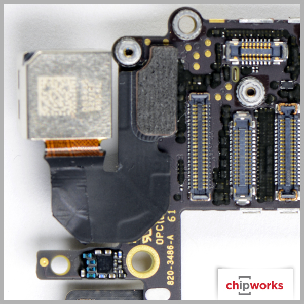 过去在 iPhone 内置的指南针一直是 AKM 半导体公司的芯片。三星、LG、摩托罗拉、华为、中兴等厂商也都是用 AKM 的指南针。但是令人费解的是,在 PCB 找不到 AKM 零件的影子,只看到 InvenSense MPU7 系列传感器,旁边则是一块 2mm x 2mm 的博世传感器装置。起初误以为这是 eCompass 指南针芯片,但封装尺寸和标记跟博世网站公布的又不符。经过剖析发现,这跟许多手机内置的 BMA280(博世的加速计)很像。问题出现了:指南针哪儿去了?为什么苹果要在手机内置两个加速计?