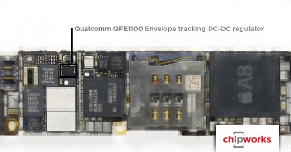 高通的 Qualcomm QFE1100 envelope tracking DC-DC regulator,在今年的很多手机也有发现了,仅今年就有超过 16 款手机采用这种芯片,三星 Galaxy 系列也在用。