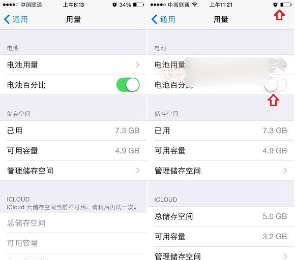 简单三步,就可以轻松进入iOS8电量百分比设置界面,这里的设置非常简单,就一个控制开关,要关闭还是开启,用户可以任意切换。