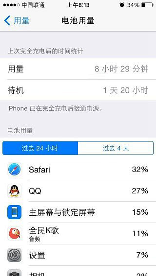 iOS8电量管理中,会显示“过去24小时”以及“过去4天”耗电应用排行,从可以帮助我们在平常使用的时候,尽量关闭这些耗电大户。