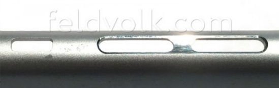 当然,镂空带来的问题在于,一体式阳极电镀铝后盖的坚固性遭到削弱。镂空部位集中于一个狭窄的水平带,这意味着对手机顶部或底部用力会特别有效地作用于那个区域,从而产生弯曲。从以下这张后盖照片中,可以看到音量键镂空处周围只剩下很少的实体部分: