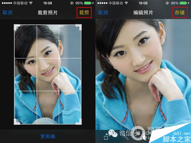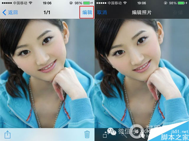 打开你想隐藏的照片(这里我就以景甜同学照片为例啦)后,然后点击右上角的“编辑”,然后再点击右下角的“裁剪”图标。