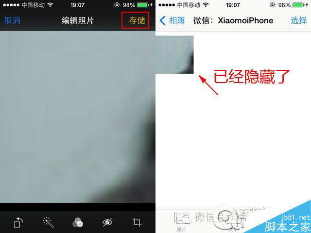 拖到看不清主体后就可以点击右上角的“裁剪”了,最后点击右上角的“存储”就大功告成啦。看看照片已经看不清是什么东西了吧。那我想还原怎么办呢?不用担心,接着看下面怎么复原吧。