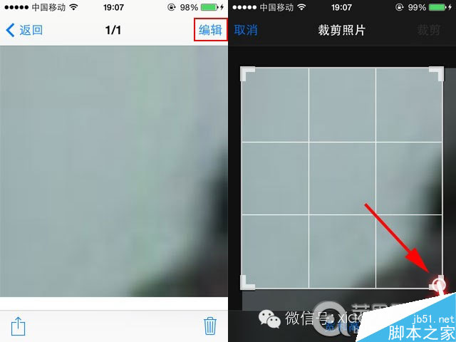 第一步. 打开刚才被隐藏的那张照片,然后点击右上角的“编辑”再点击右下角的裁剪图标,然后按住网格的右下角向右下角拉动。