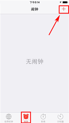 1)打开iPhone6的【时钟】,选择【闹钟】栏,点击右上角【+】。(如下图)