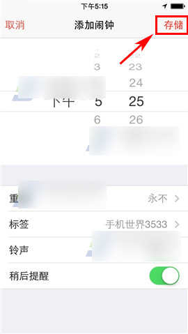 2)在【添加闹钟】页面,上方可选择【闹钟响铃时间】,下方可设置闹钟的【重复】方式、【标签】、【铃声】以及是否开启【稍后提醒】,都设置完后,点击右上角【存储】即可完成闹钟添加。(如下图)