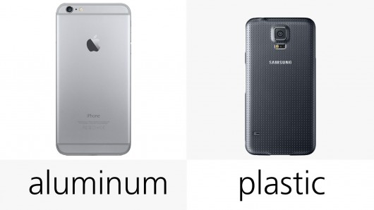材质:iPhone6 Plus采用了一体成型的铝合金外壳(带弧边),而握感更轻更舒适的Galaxy S5则为塑料。