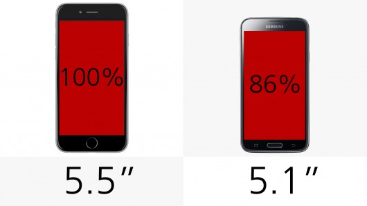 屏幕:iPhone6 Plus为5.5英寸,Galaxy S5为它的86%(5.1英寸)。