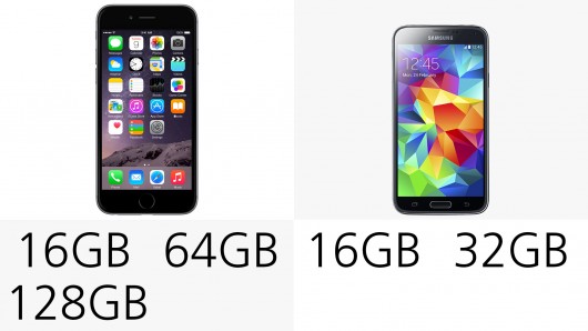 存储容量:iPhone6 Plus提供16/64/128GB的版本,而Galaxy S5提供16GB/32GB的版本。