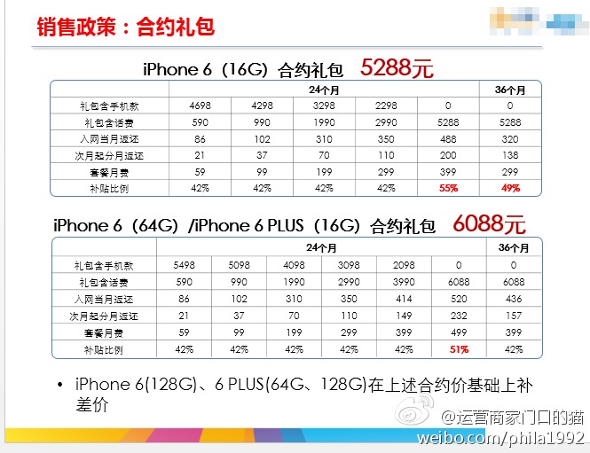 iPhone 6和iPhone 6 Plus在今日凌晨0时(稍微晚一点)开始接受预定,不仅是官网,各大电商平台也都同步启动。与此同时,运营商方面的合约机消息也陆续曝光。昨天下午,微博网友@运营商家门口的喵就曝光了电信的良心套餐,今天@瑞记也带来了联通的版本,大家来看看哪个更划算。