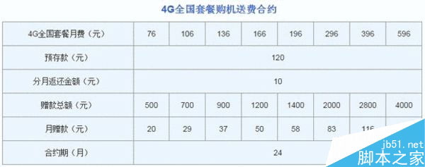 而若选择购机送话费,合约期限仅一种24个月,预存款120元,每月返还10元。76、106、136、166、196、296、396、596元的套餐分别对应的赠款总额为500、700、900、1200、1400、2000、2800、4000元,分24个月返还。
