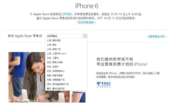 北京时间2014年10月10日,国行iPhone 6和iPhone 6 Plus首次在苹果官网在线商城开启预约。与往年不同的是,今年根据地域的不同,部分地区的用户将有机会在10月17日当天就收到邮寄的新iPhone。