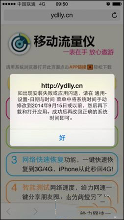 2、进入“设置—通用—日期与时间”,取消自动设置,并将时间调至9月15日或更早。然后打开Safari,输入ydlly.cn,下载移动流量仪。