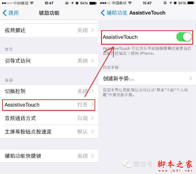 第一步:首先需要开启Assistive Touch。 进入设置——通用——辅助功能——Assistive Touch,选择打开。