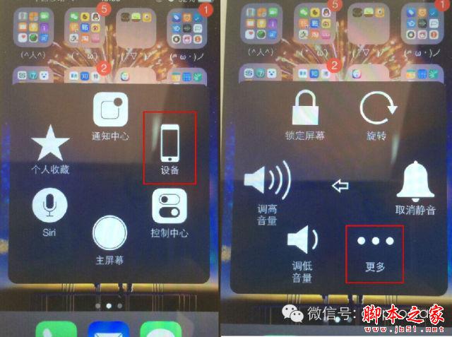 第二步:成功开启Assistive Touch小圆点之后,点击主屏上的“小圆点”,然后点击“设备”按钮,再点击“更多”选项 。