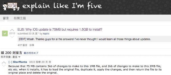 但是,问题来了。为什么iOS的升级需要那么多空间?几周前 Reddit用户“kapits” 曾在iOS8更新时提出了类似问题,一位叫做StarManta的用户给出了比较详细的解释。