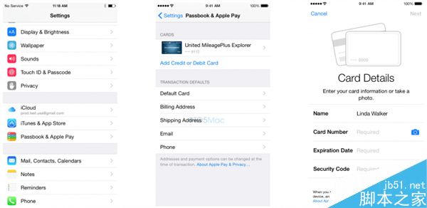 根据苹果内部培训材料,Apple Pay 可以通过 Passbook 来设置,具体位置是初次设置 iOS 8 的时候,或者在 "设置" 里的新标签页 "Passbook & Apple Pay",此前 iOS 8.1 已经曝光了一些图片。通过 iPhone 的摄像头,用户可以扫描信用卡,将信息加入到 Passbook 里面。也可以用和 iTunes 账户绑定的信用卡。根据苹果内部培训材料,Passbook 最多只能存储 8 张信用卡/借记卡。