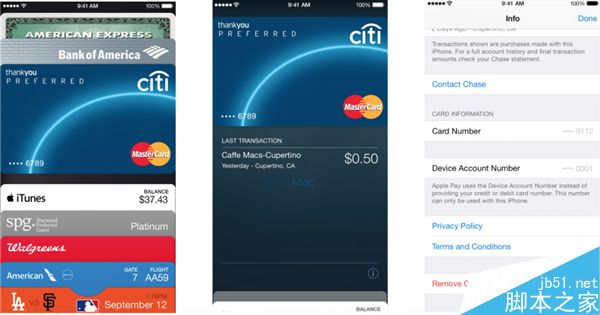 有趣的是,在 Passbook & Apple Pay 设置页面中,相关银行和信用卡公司会显示深一步信息。每一张绑定的卡,用户都可以看到最近的交易记录,到 iTunes 应用商店的快捷方式,去下载银行和信用卡公司的伴侣应用,以及联络发卡银行,还可以收到推送通知,和显示信用卡号码和 "独一设备账户号码 (unique device account number)"。