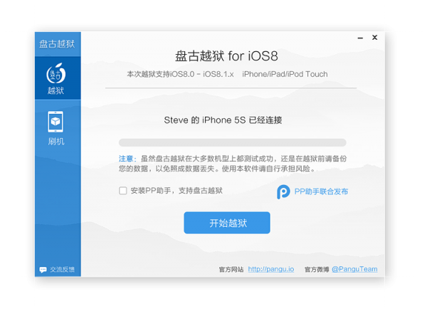 由于越狱存在生命周期,无法得知苹果在何时会封堵漏洞。因此你也可以先越狱,等Cydia完成兼容后,就可以通过手机上的盘古APP来下载安装Cydia,或者通过SSH等途径也可以安装。此外,PP助手越狱版也能完美兼容iOS8系统,方便用户下载安装软件。