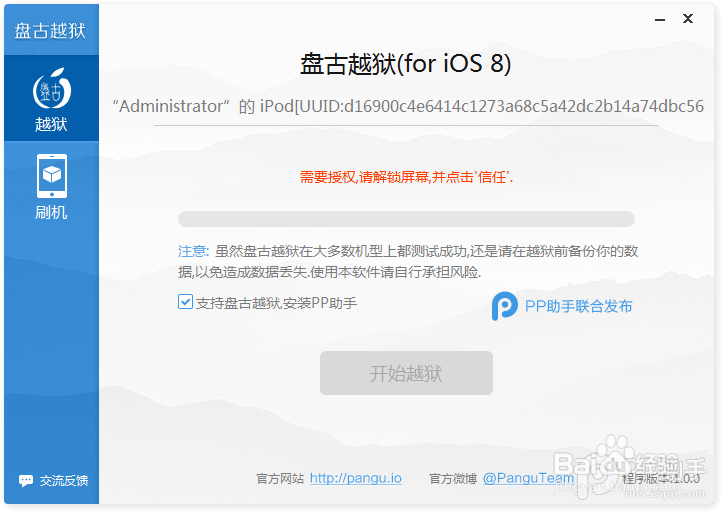 7. Q:越狱过程中出现“需要授权,请解锁屏幕,并点击“信任”。