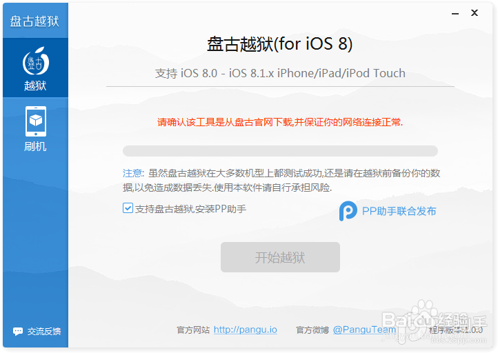 8. Q:越狱过程中出现“请确认该工具是从盘古官网下载,并保证你的网络连接正常”。