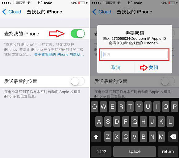 二、进入iCloud设置后,我们将里面开启的东西全部关闭即可,主要是关闭【照片】、【备份】、【查找我的iPhone功能】,将这几项关闭,基本就等于关闭了iPhone6的iCloud了。如下图所示为关闭【查找我的iPhone功能】,期间需要输入Apple ID密码,如下图所示。