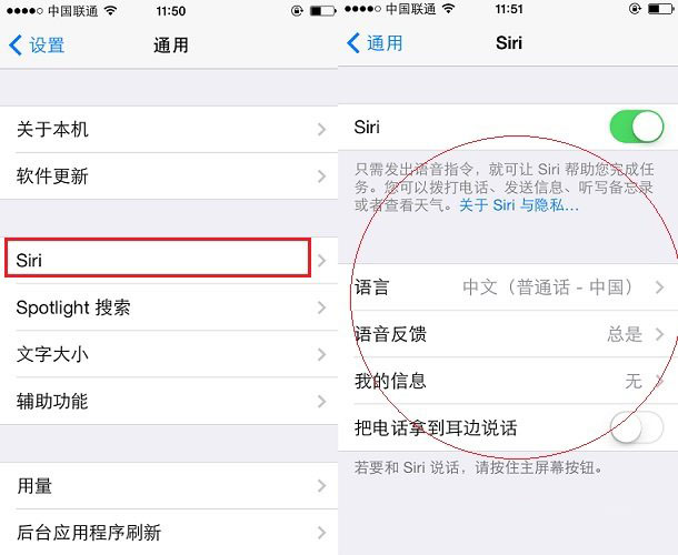 进入iPhone6的设置,找到“通用”设置,在里边我们即可看到有Siri入口,点击进入即可查看siri的一些语音功能了,如下图所示: