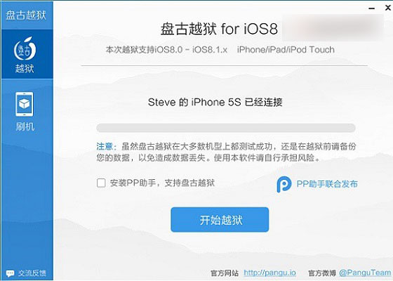 将iOS8设备连接电脑,并打开盘古iOS8越狱工具