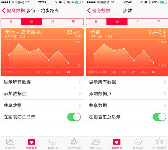 iOS8自带的“健康”应用,在iOS8.1中已换成中文“健康”字样,点击图标进入的默认界面是“图表汇总”。在这里大家会发现该应用已经默默的为我们记录了每天的步行和跑步距离的数据。