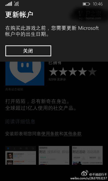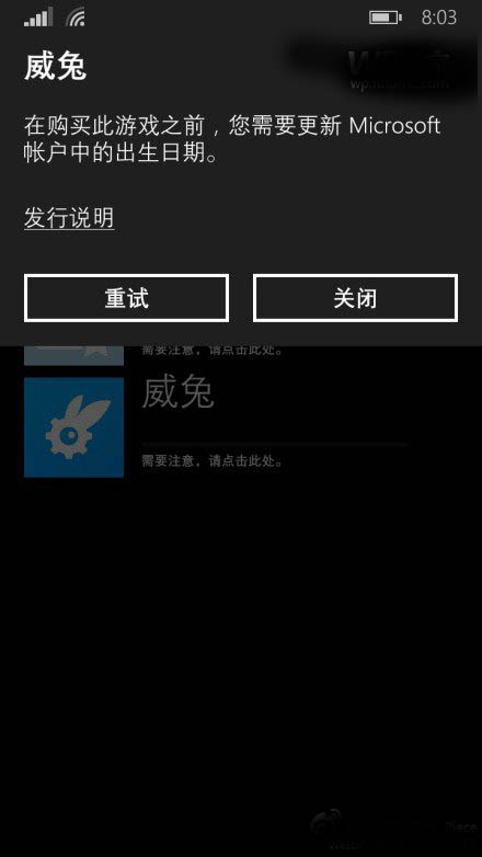 今天@WP之家 的一些网友在微博上,向我们反馈,WP8/WP8.1商店出现无法下载问题,但是问题并非是常见的商店大姨妈,而是提示需要“更新帐户”,不管是应用还是游戏提示,在购买此游戏前,您需要更新Microsoft帐户中的出生日期。