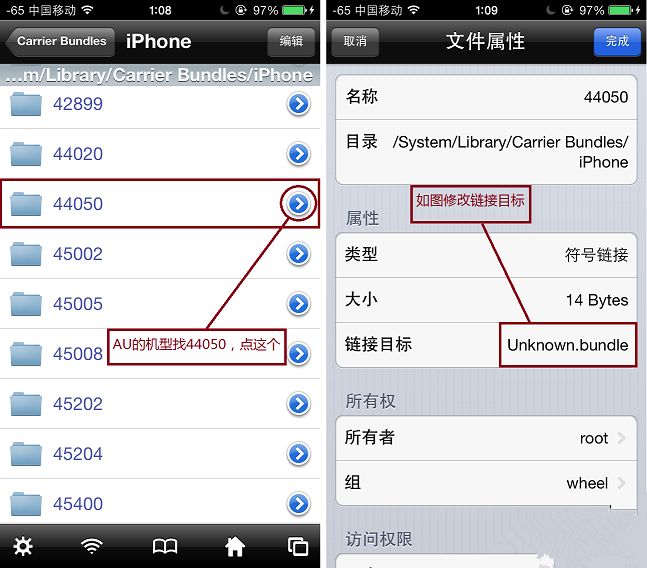 打开iFile,进入/System/Library/Carrier Bundles/iPhone,找到44010(docomo为例,其它运营商的请查找对应IMSI数据的前5位),修改文件属性,修改链接目标Unknown.bundle,点完成退出,至此第一步修改完毕。图示: