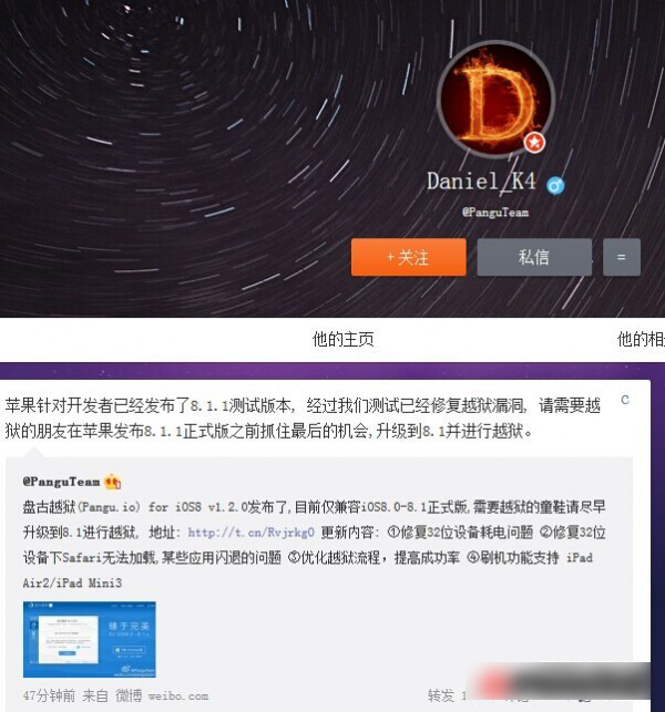 @Daniel_K4表示,iOS 8.1.1测试版已经修复了越狱漏洞,毫无疑问未来发布的正式版也会是这个样子。所以推荐有意越狱的用户火速升级到iOS 8.1并越狱,这应该是iOS 8.1.1正式版发布之前最后的机会了。另外值得一提的,盘古团队刚刚发布了iOS 8.1完美越狱工具1.2版,修复了此前存在的诸多问题。