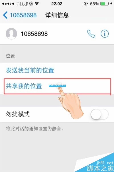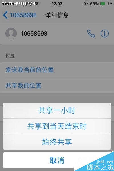 第二步,在“详细信息”页面,点击“共享我的位置”,会弹出共享时间选项,用户可以选择共享一小时,也可选择始终共享。