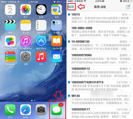 一、进入iPhone6桌面界面,然后找到并点击进入【信息】,在iPhone6短信界面,再点击左上角的【编辑】,如下图所示。