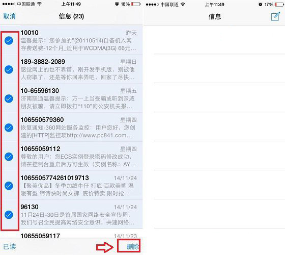 二、接下来我们勾选上需要删除的短信,如果需要批量删除短信,同时勾选多条需要删除的短信即可,完成后,点击底部右下角的【删除】即可,之后就可以批量删除所有短信了,如下图所示。