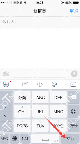 iphone自带输入法是肯定有换行的,大家可以看到在编辑短信的时候吗,输入法右下角会有换行的选项,无论下载百度还是搜狗输入法都有换行二字,如图: