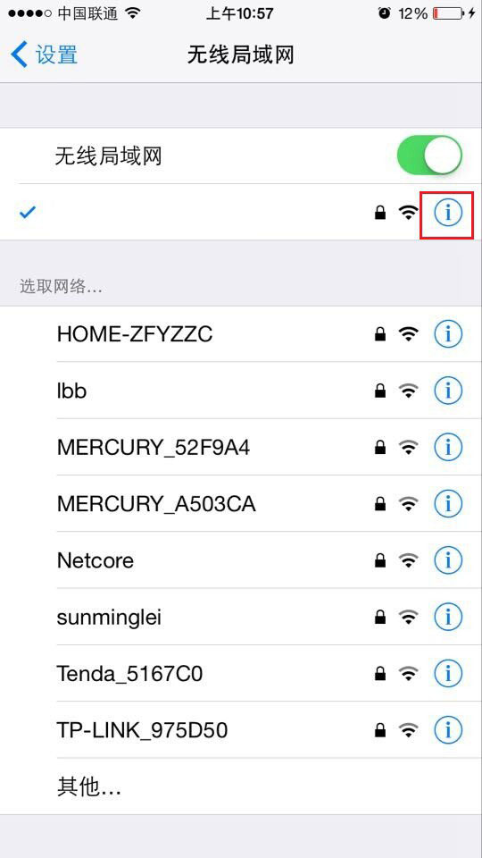 三、进入无线局域网设置后,再点击iPhone已经连接的Wifi无线网名称后面的【i】,如下图所示。