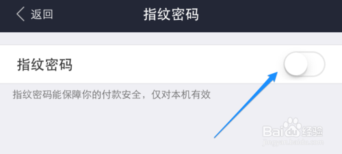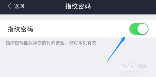 11、接着看到当前“指纹支付”的开关已经打开,说明指纹支付已经生效。