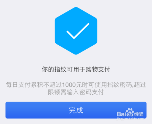 10、随后提示我们用于在支付宝中的指纹支付已经设置成功,但为了安全考虑,当天累积金额不超过1000元时可以直接使用指纹来支付。