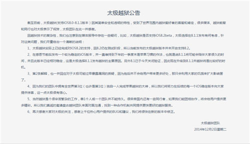 对此太极团队也给出了自己的回应:1.太极越狱已经支持IOS 8.2系统,只是时候未到,所以并未发布。2.IOS 8.2明年才会发布,且IOS 8.1.1已经稳定,此时越狱是个不错的时机。3.暴露漏洞并非冲动之举,拖后也不会给用户带来好处。除此之外,太极团队也对大家的关心表示了感谢。