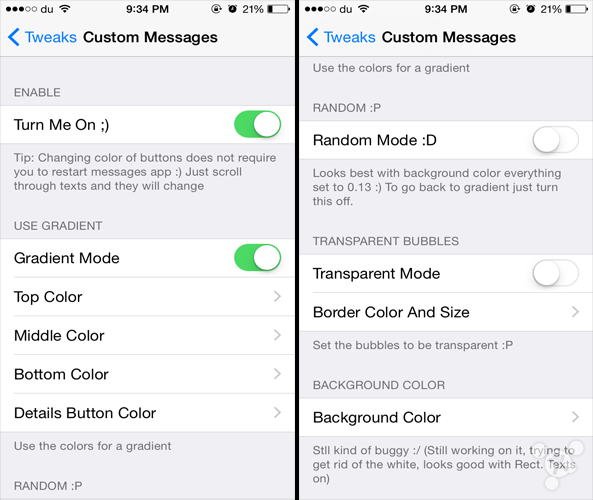 经反映,这款插件的一个主要问题就是如果你禁用了渐变或者打开透明模式的话,信息气泡会变为矩形。如果你对这款插件感兴趣,不妨到 BigBoss 源进行下载,售价 1.99 美元。