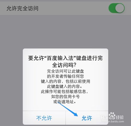 4、随后在输入法列表里,点击打开百度输入法,然后再选择“允许完全访问”这个选项。