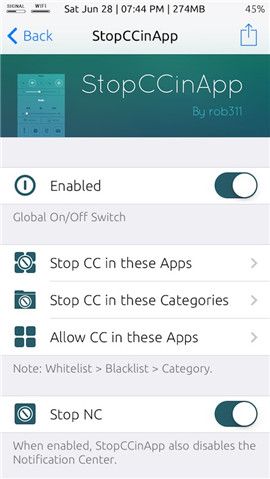 《StopCCinApp》可以为用户提供禁止控制中心出现的某些App激活功能,用户可根据需要进行自定义,共有三个选项:禁止控制中心在这些App中激活、禁止app在这些文件夹中激活和总是在这些App中激活。