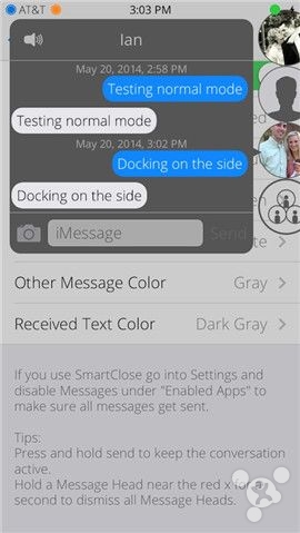 如果你是一位经常使用短信的人,那么这款插件《MessageHeads》将给你带来非常便利的功能。它给用户提供了Facebook式的聊天头像,将所有联系人整合到了一个圆形图标中,常用联系人均以圆形头像显示在系统最上方,通过点按聊天头像,用户可快速呼出一个聊天小窗口,高效进行文字聊天和图片聊天。