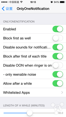 《OnlyOneNotification》是一款简单的小插件,安装之后只会让某个App的第一个通知显示在锁屏界面上,此后该App再次通知时就不会再显示了。通过设置可以进行自定义设置,比如屏蔽首次推送、关闭通知声音等,还可以选择想要屏蔽的App。