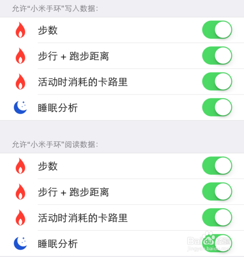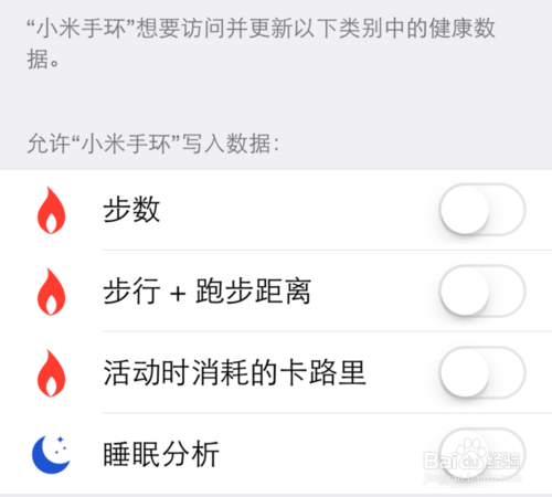 2、当更新到小米手环最新版本以后,接下来打开应用时,会让我们选择要与 iPhone 健康共享数据的项目,可以根据自己的需要来选择。可以选择如步数、距离、睡眠分析等数据。