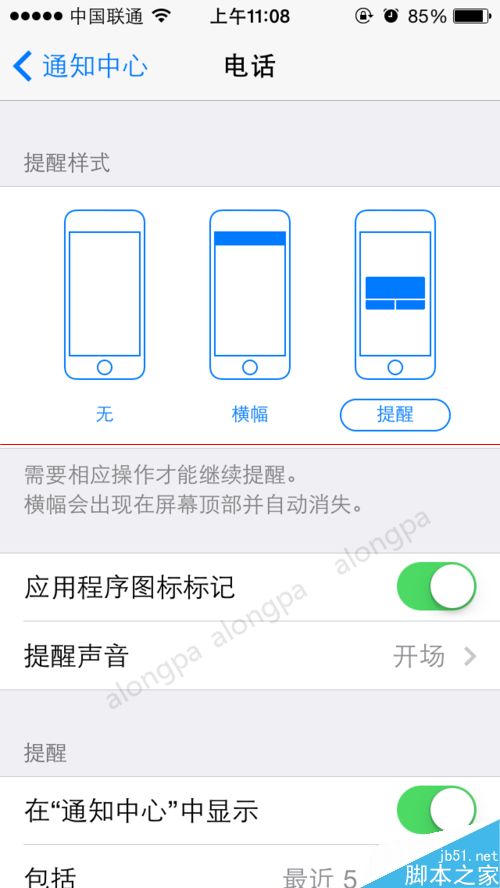 1、网上搜了很多帖子都说要越狱。自己摸索了一下,发现原来不用越狱的,只是稍微麻烦点,多了两步。首先,打开设置——通知中心,可以看到下面每个APP都有提示,标记、提醒、横幅。