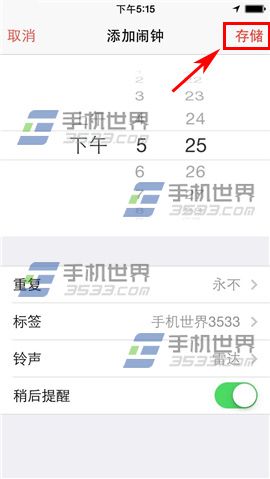 2)设置好时间根据所需我们还可以设置【重复】时间跟闹钟【铃声】设置好后点击【存储】即可。(如下图)