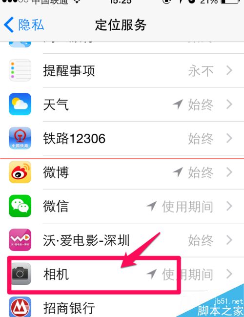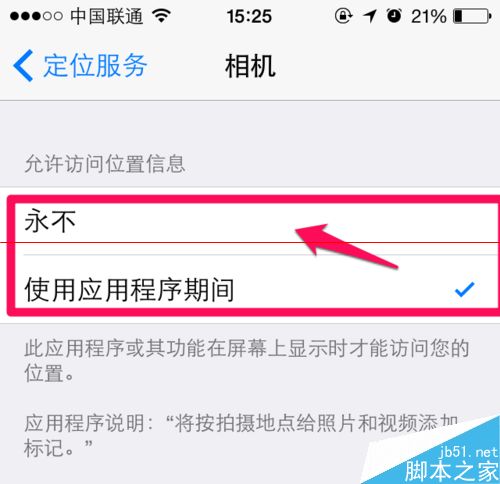 5、在这里可以看到默认是相机使用定位服务,拍摄时候会自动记录位置信息。选择永不即可关闭相机拍照时候照片自动记录位置信息。