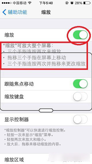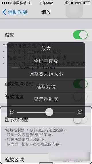 4.三个手指连按两次屏幕,会出席如下界面,可以调整缩放大小,如图: